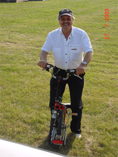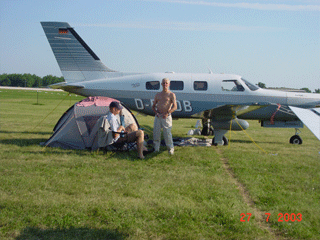 The 6PW leads the way, does ATC and has the transponder on, DB follows, max. 1 NM, the way Milwaukee Control wants it, with TCAS and corresponding arrangements before any changes in course or altitude without any problems. Landing at 01:02 UTC, just after 20:00 local time and therefore before dark with 300 m interval. Welcome to Oshkosh from the Tower. Parking position on the campground and then first of all put up the tents. Later reception in the DB’s noble housing (our tent was not really suited to entertaining visitors, but rather to causing hilarity): champagne, not cooled, cheers. Oshkosh, we have arrived. Next morning, Saturday, 26th July, 2003: blue skies, but where are the planes? Apart from a couple of hundred on the ground and a few in the air, hardly any traffic at all, no more than in Frankfurt really. How are they going to fill up the enormous parking areas? The reason – a huge storm front to the north and west of KOSH is preventing a number of planes from taking off and forcing them to postpone until Sunday. Everything’s big in America – steaks, skyscrapers and the CB’s too. Quite a lot of activity in progress on the airfield, in particular the builders, who, with just three days to go before the opening, still haven’t got a single stand up. Our folding bicycles are proving useful here on the airfield – with runways of 6700 ft and 8000 ft - where we’ll be living for the next few days. Aching feet in the evening (at the DB), a