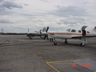 On the way to Iqaluit, formerly Frobisher Bay, we once again fly over the bad weather at 27,000 feet. FB unexpectedly turns out to be a rather busy airport, even in the morning: airlines, helicopters, Air Force, suppliers, GA all under one roof, buzzing around like a swarm of bees in the brilliant sunshine, demonstrating that Newfoundland definitely is not a lonely place in the middle of nowhere. We are greeted amicably by a Can Pass Immigration Officer, whose family, judging from the name, originally came from Germany. When asked he tells us how his grandfather emigrated from Weil am Rhein after the war. And to top it all, but not before we are nearly ready, it turns out he even speaks German, and not at all badly. Thousands of nasty big mosquitoes descend