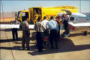 Wir entschließen uns, nach Aswan für eine technische Landung zu fliegen. Wie erwartet, will Kairo unsere diplomatische Freigabe haben. Diese geben wir sofort, da wir überzeugt sind, dass die Erlaubnis, die wir von FSI bekommen haben, eine diplomatische sein muss. Am Boden werden wir nicht vom Blitz getroffen, sondern von der Hitze erschlagen: 45° C im Schatten. Nur gibt es am Platz keinen Schatten, keine Luftfeuchtigkeit. Innerhalb von einigen Minuten sind wir erschöpft, noch ein bisschen krank nach dem letzten Essen. Und sicherlich haben wir viel zu wenig Wasser getrunken. Schwierige Verhandlungen mit den Ägyptischen Behörden und ganz schlechte Nachrichten: Holger hat den Tankdeckel für die Langstreckentanks kaputtgemacht. Hat er natürlich nicht absichtlich gemacht – nur Alterung des Materials. Trotzdem geht nichts mehr, wenn er nicht repariert wird. Keine Egypt Air Werkstatt in der Nähe, niemand am Platzrand außer uns, nur ein sehr altes BAC 1-1 Memphis Air und drei Typen, die darunter werkeln. Wir gehen rüber, und erfahren, dass das Flugzeug in Rumänien registriert ist. Die drei Memphis Air Mechaniker benutzen eine Nadel, um hydraulische Röhre zu reparieren. Sie brauchen 45 Minuten. Danach ist unser Deckel mit der Hilfe einer Edelstahlschiene, die sie in der Tasche hatten, wieder ganz. Noch eine Flugstunde und wir sind vor Sonnenuntergang an unserem Tagesziel angekommen – Sharm el Shei.